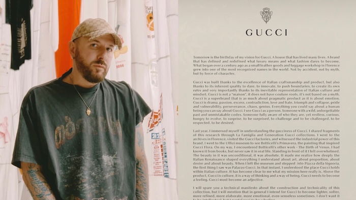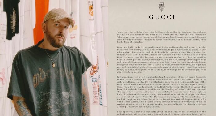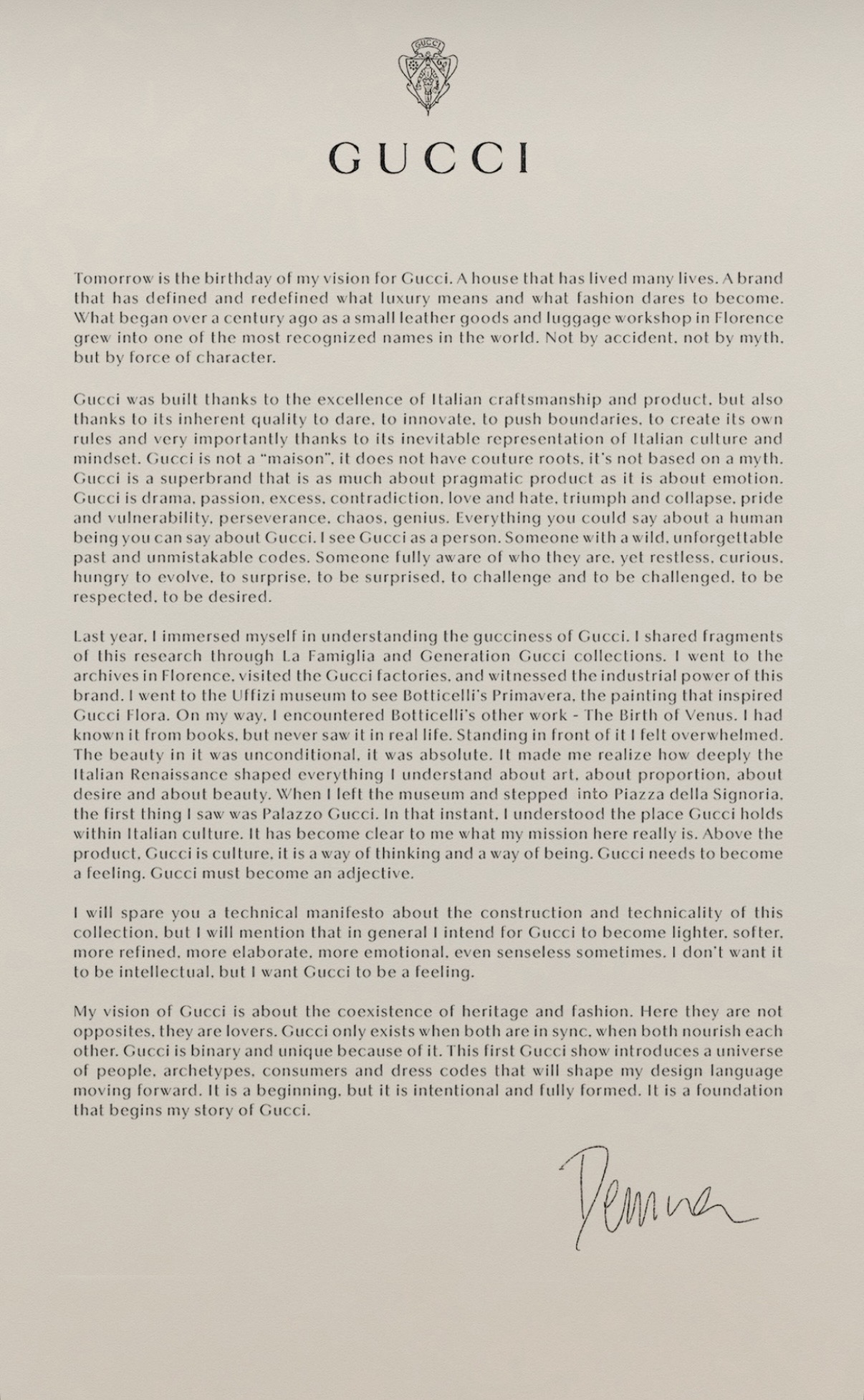 Gucci-ს ინსტაგრამ გვერდზე გამოქვეყნდა დემნას წერილი სადაც, ის ბრენდის მომავლის შესახებ საკუთარ ხედვას ავრცელებს და აცხადებს, რომ მისი მიზანი Gucci-ს არა მხოლოდ მოდის სახლად, არამედ კულტურულ და ემოციურ გამოცდილებად ჩამოყალიბებაა. დიზაინერი Gucci-ს ცოცხალ ორგანიზმად აღწერს — ბრენდად, რომელსაც აქვს „ველური, დაუვიწყარი წარსული და უტყუარი კოდები“. მისი თქმით, Gucci ერთდროულად არის დრამა, ვნება, წინააღმდეგობა, ტრიუმფი და დაუცველობა — ისეთივე მრავალფეროვანი, როგორც ადამიანი. მისი განცხადებით, ახალი შემოქმედებითი მიმართულება ბრენდის უფრო მსუბუქ, რბილ და ემოციურ ფორმას შექმნის. დემნა აღნიშნავს, რომ მისი ხედვა მემკვიდრეობისა და თანამედროვე მოდის თანაარსებობას ეფუძნება — სადაც წარსული და აწმყო ერთმანეთს ეწინააღმდეგება კი არა, არამედ ავითარებს. მისივე თქმით, პირველი კოლექცია წარმოადგენს საფუძველს, რომელიც მომავალში Gucci-ს ახალი დიზაინის ენას ჩამოაყალიბებს და ბრენდის ისტორიაში ახალ ეტაპს გახსნის.