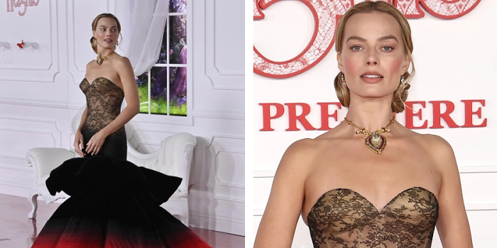 რაც შეეხება მსახიობის კაბას, პრემიერისთვის მსახიობმა Schiaparelli-ის კაბა შეარჩია, რომელიც „ჰოლივუდის ოქროს ხანის“ ესთეტიკასა და გოთიკის ბნელ რომანტიკას შორის ლავირებს. ეს უნიკალური ქმნილებაა, რომელიც დენიელ როუზბერის არცერთ ჩვენებაში არ იყო წარმოდგენილი, თუმცა ფერითა და აგებულებით მაღალი მოდის კოლექციას მოგვაგონებს, რომელიც სულ ახლახან იყო წარმოდგენილი.